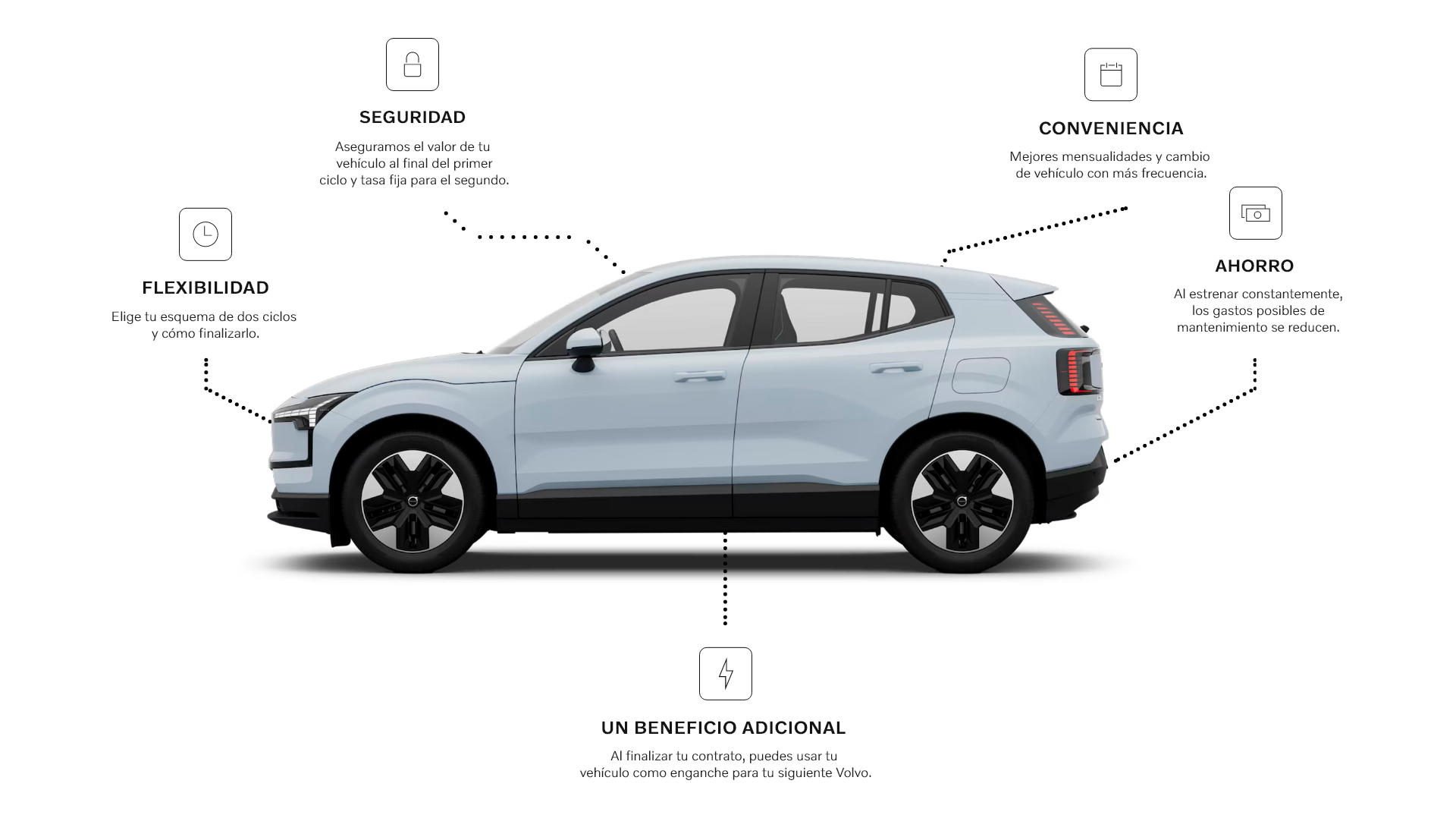 El presente no constituye un contrato de compraventa ni de financiamiento aprobado, promesa de venta ni una declaración unilateral de voluntad de Volvo Car México o de BANCO SANTANDER MÉXICO, S.A., INSTITUCIÓN DE BANCA MÚLTIPLE, GRUPO FINANCIERO SANTANDER MÉXICO. Los cálculos, mensualidad y opciones de pago que arroja la pantalla, son ejemplificativos y no constituyen una aprobación crediticia. Los mismos están sujetos a la aprobación crediticia y sus valores finales dependerán de BANCO SANTANDER MÉXICO, S.A., INSTITUCIÓN DE BANCA MÚLTIPLE, GRUPO FINANCIERO SANTANDER MÉXICO. Los vehículos están sujetos a disponibilidad y Volvo Car México no se hace responsable de la descontinuación o modificación de cualquier modelo. La existencia de vehículos se encuentra sujeta a disponibilidad del Distribuidor Autorizado Volvo. Consulte las opciones de pago directamente con el Distribuidor Autorizado Volvo. Volvo Car México y sus Distribuidores Autorizados son personas morales independientes. La marca Volvo, así como sus respectivos logotipos y avisos comerciales son propiedad de Volvo Car México, que es la licenciataria autorizada en los Estados Unidos Mexicanos. La marca Santander y sus respectivos logotipos son propiedad de Santander. FINANCIAMIENTO. El producto crédito automotriz es otorgado por BANCO SANTANDER MÉXICO, S.A., INSTITUCIÓN DE BANCA MÚLTIPLE, GRUPO FINANCIERO SANTANDER MÉXICO. Consulta requisitos de contratación en www.santander.com.mx. El otorgamiento del crédito estará sujeto al resultado del análisis de crédito del solicitante y las políticas de crédito vigentes. Los términos y condiciones expresados pueden variar al momento de contratación de acuerdo con el plan de financiamiento seleccionado, por lo que sugerimos consultarlos con su distribuidor autorizado Volvo.